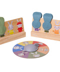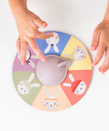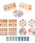 Habilidades de reconocimiento y conteo a través del juego. Este juego educativo para dos implica girar la flecha y colocar clavijas de conejito en el tablero de juego de madera según la imagen que aparece. El primer jugador que coloque 4 conejitos en un tablero de madera gana.