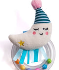 Un tierno sonajero de luna con un anillo fácil de agarrar con varias opciones de agarre. Al jugar con sonajas, el bebé desarrolla los sentidos y la motricidad fina.