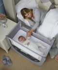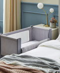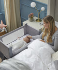 • Bloquee fácilmente la barandilla en su lugar para dormir junto a la cama o úsela como cuna independiente.